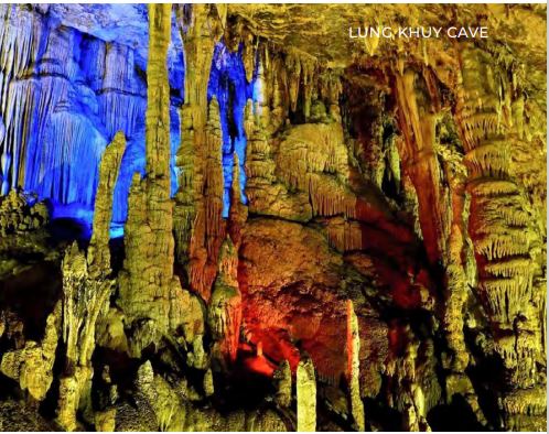 • After lunch time at TAM SON town, you will trekking (2km) to Lung Khuy Cave where was developed in the heart of limestone mountains that were formed under the ancient sea more than 400 million years ago. Around the cave is a landscape of karst clusters of peaks - valleys with many cones, pits, hanging valleys, limestone shelves...on a flat surface at an altitude of 850-1100m above sea level.